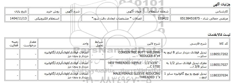 | مرتضی جمالی شاد - 05138451875 | 170422 | اتصالات * مشخصات ابعادی دقت شود* | استعلام الکترونیکی | 1404/11/13 |