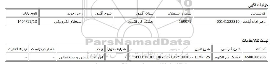 | ناصر امان آبادی - 05141522310 | 169971 | خشک کن الکترود | استعلام الکترونیکی | 1404/11/13 |