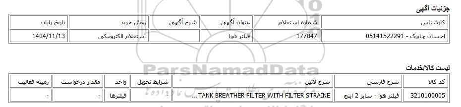 | احسان چابوک - 05141522291 | 177847 | فیلتر هوا | استعلام الکترونیکی | 1404/11/13 |