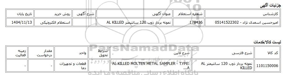 | امیرحسین اسعدی نژاد - 05141522302 | 178436 | نمونه بردار ذوب 120 سانتیمتر AL KILLED | استعلام الکترونیکی | 1404/11/13 |