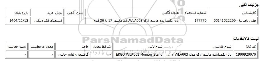 | علی ناصرنیا - 05141522299 | 177770 | پایه نگهدارنده مانیتور ارگو WLA003برای مانیتور 17 تا 30 اینچ | استعلام الکترونیکی | 1404/11/13 |