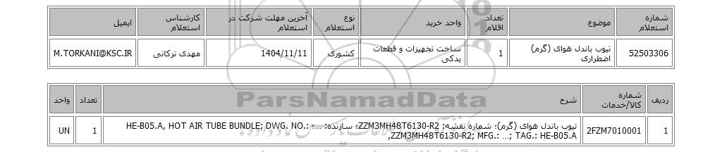 | 52503306 | تیوب باندل هوای (گرم) اضطراری | 1 | ساخت تجهیزات و قطعات یدکی | کشوری | 1404/11/11 | مهدی ترکانی | M.TORKANI@KSC.IR |
