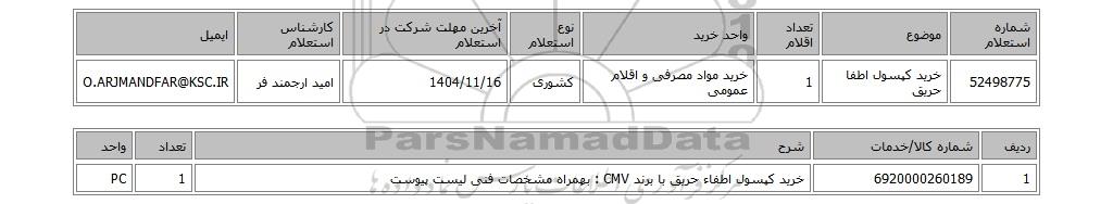 | 52498775 | خرید کپسول اطفا حریق | 1 | خرید مواد مصرفی و اقلام عمومی | کشوری | 1404/11/16 | امید ارجمند فر | O.ARJMANDFAR@KSC.IR |