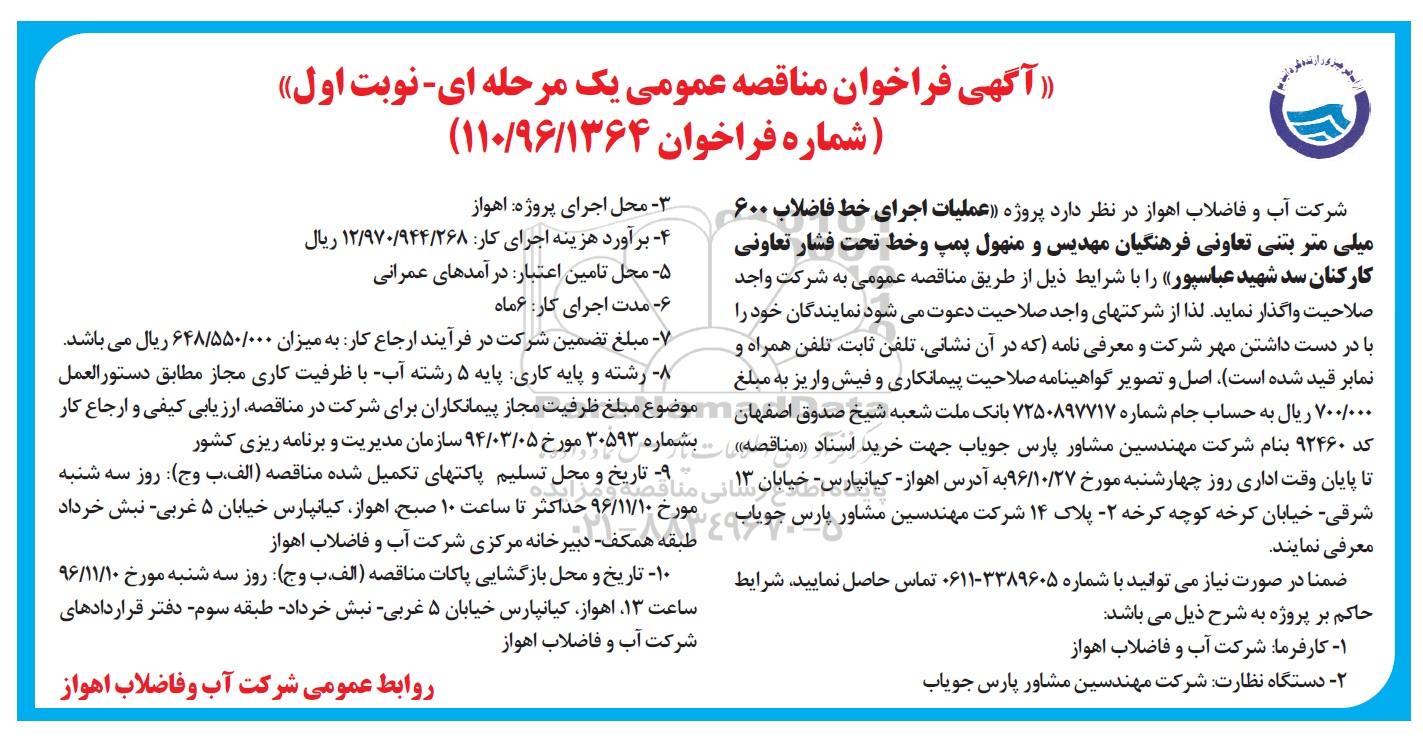 شرکت آب و فاضلاب اهواز در نظر دارد پروژه عملیات اجرای خط فاضلاب 600 میلی متر بتنی تعاونی فرهنگیان مهدیس و منهول پمپ و خط تحت فشار تعاونی کارکنان سد شهید عباسپور را با شرایط ذیل از طریق مناقصه عمومی به شرکت واجد صلاحیت واگذار نماید. لذا از شرکتهای واجد صلاحیت دعوت می شود ، نمایندگان خود را با در دست داشتن مهر شرکت و معرفی نامه(که در آن نشانی،تلفن ثابت، تلفن همراه و نمابر قید شده است)، اصل و تصویرگواهینامه صلاحیت پیمانکاری و فیش واریز به مبلغ 700.000 ریال به حساب سپهر شماره  7250897717  بانک ملت شعبه شیخ صدوق اصفهان کد 92460 به نام شرکت مهندسین مشاور پارس جویاب جهت خرید اسناد مناقصه تا پایان وقت اداری روز چهارشنبه مورخ 96.10.27 به آدرس اهواز - کیانپارس - خیابان 13 شرقی - خیابان کرخه کوچه کرخه 2- پلاک 14 شرکت مهندسین مشاور پارس جویاب معرفی نمایند.