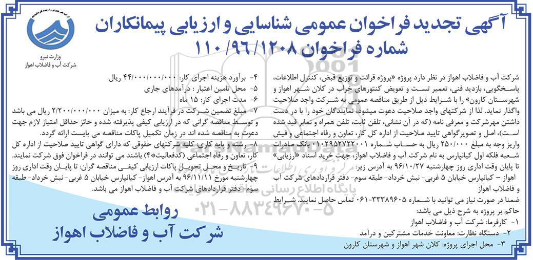 شرکت آب و فاضلاب اهواز در نظر دارد پروژه قرائت و توزیع قبض ، کنترل اطلاعات ، پاسخگویی ، بازدید فنی ، تعمیر تست و تعویض کنتورهای خراب در کلان شهر اهواز و شهرستان کارون را با شرایط ذیل از طریق مناقصه عمومی به شرکت واجد صلاحیت واگذار نماید لذا از شرکتهای واجد صلاحیت دعوت می شود نمایندگان خود را با دردست داشتن مهر شرکت و معرفی نامه که در آن نشانی ، تلفن ثابت ، تلفن همراه و نمابر قید شده است اصل و تصویر گواهی تایید صلاحیت ا زاداره کل کار ، تعاون و رفاه اجتماعی و فیش واریز وجه به مبلغ 250.000 ریال به حساب شماره 0102952722001 بانک صادرات شعبه فلکه اول کیانپارس به نام شرکت آب و فاضلاب اهواز جهت خرید اسناد ارزیابی تا پایان وقت اداری روز چهارشنبه 96.10.27 به آدرس زیر