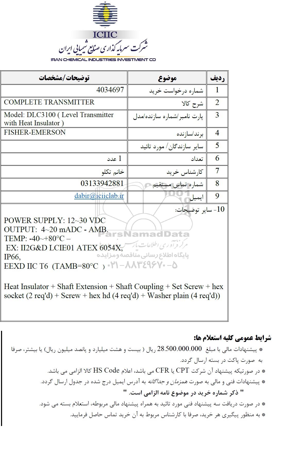 | 3 | پارت نامبر/ شماره سازنده /مدل | Model: DLC3100 (Level Transmitter with Heat Insulator) |