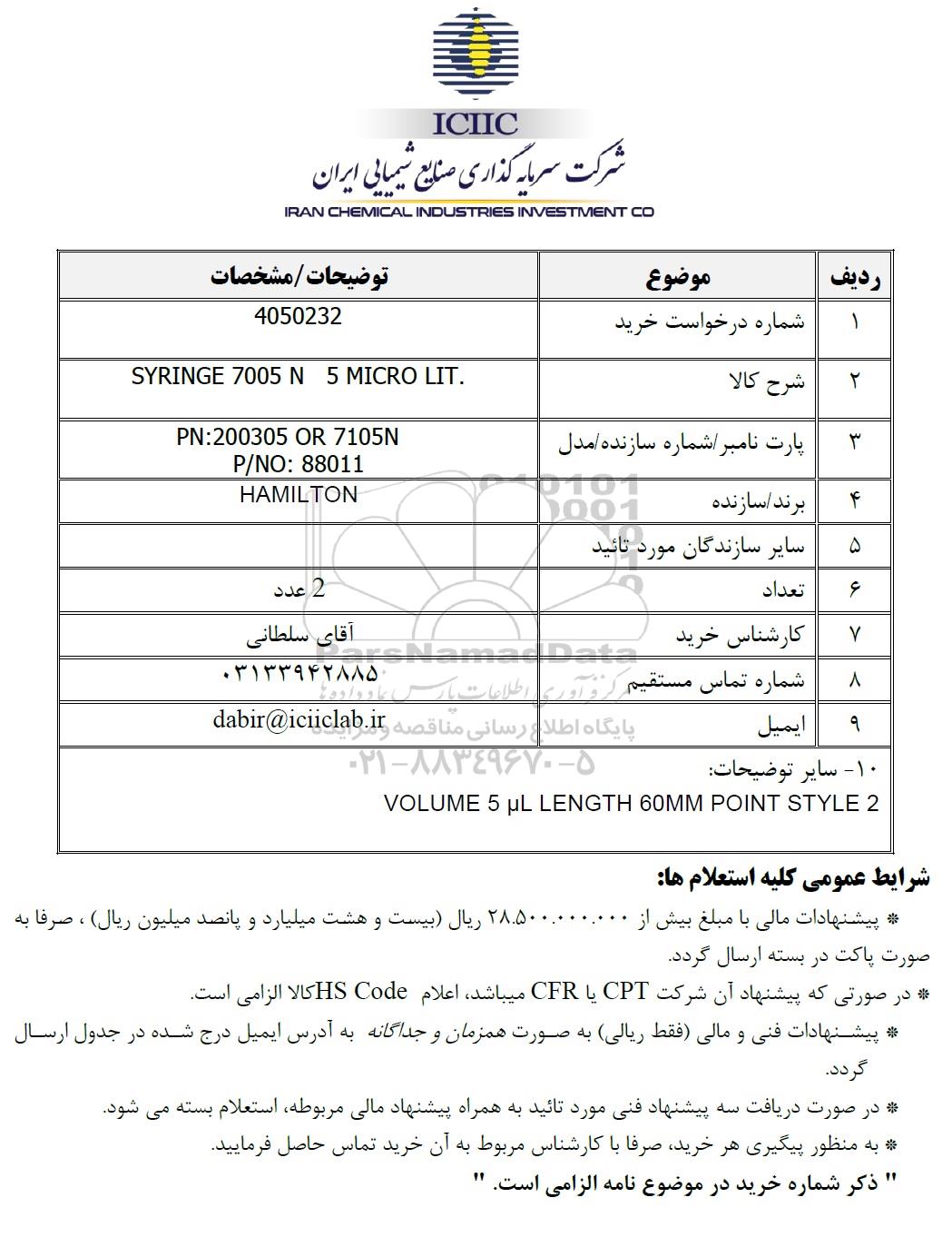 | 2 | شرح کالا | SYRINGE 7005 N 5 MICRO LIT |