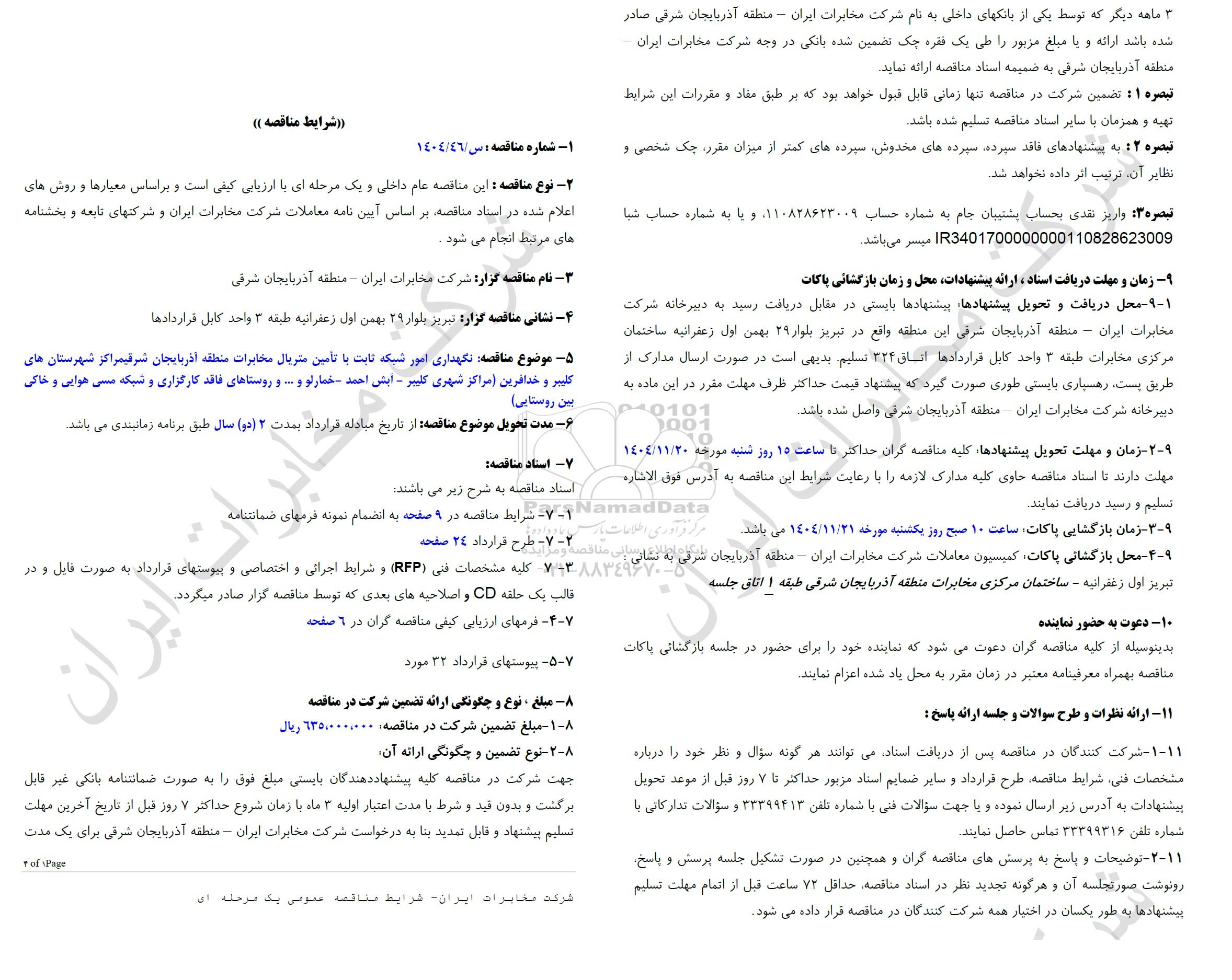 5- موضوع مناقصه: نگهداری امور شبکه ثابت با تامین متریال مخابرات منطقه آذربایجان شرقی مراکز شهرستان های کلیبر و خدافرین (مراکز شهری کلیبر - آبش احمد - خمارلو و... و روستاهای فاقد کارگزاری و شبکه مسی هوایی و خاکی بین روستایی)