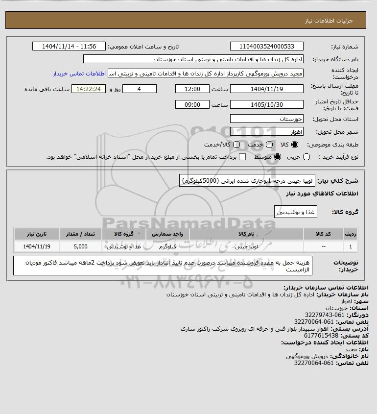 شرح کلی نیاز: لوبیا چیتی درجه 1بوجاری شده ایرانی (5000کیلوگرم)