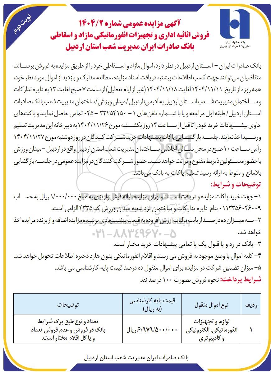 فروش اثاثیه اداری و تجهیزات انفورماتیکی مازاد و اسقاطی بانک صادرات ایران مدیریت شعب استان اردبیل