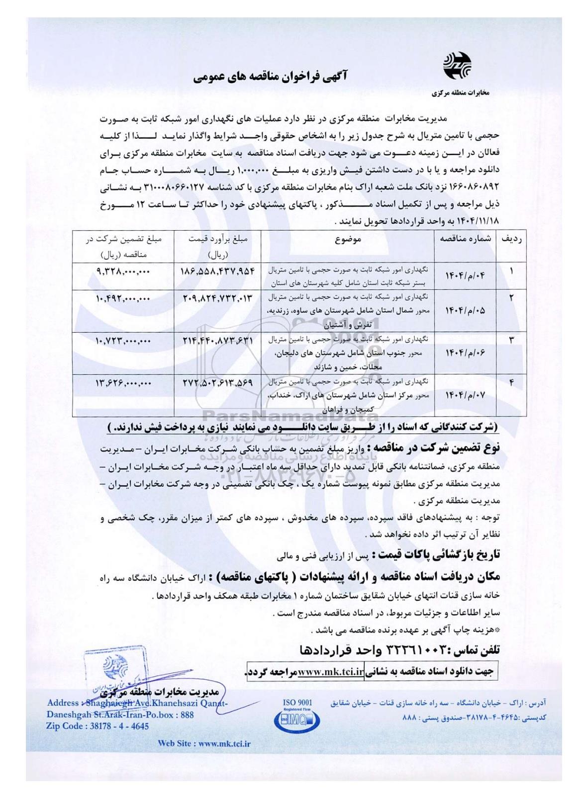 | 4 | 07/م/1404 | نگهداری امور شبکه ثابت به صورت حجمی با تامین متریال محور مرکز استان شامل شهرستان های اراک ، خنداب، کمیجان و فراهان | 272.502.613.569 | 13.626.000.000 |