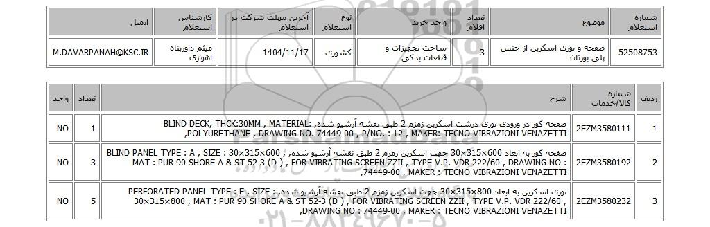 | 52508753 | صفحه و توری اسکرین از جنس پلی یورتان | 3 | ساخت تجهیزات و قطعات یدکی | کشوری | 1404/11/17 | میثم داورپناه اهوازی | M.DAVARPANAH@KSC.IR |