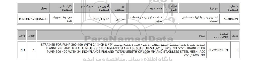 | 52508759 | استرینر پمپ با توری استنلس استیل | 1 | ساخت تجهیزات و قطعات یدکی | استانی | 1404/11/17 | محمد رضا منزوی زاده | M.MONZAVI@KSC.IR |