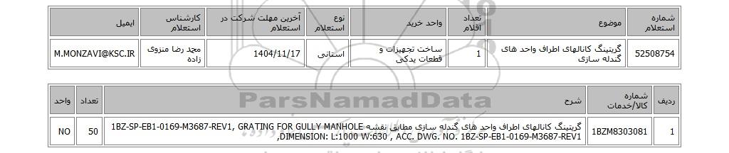 | 1 | 1BZM8303081 | گریتینگ کانالهای اطراف واحد های گندله سازی مطابق نقشه 1BZ-SP-EB1-0169-M3687-REV1, GRATING FOR GULLY MANHOLE DIMENSION: L:1000 W:630 , ACC. DWG. NO. 1BZ-SP-EB1-0169-M3687-REV1, | 50 | NO |