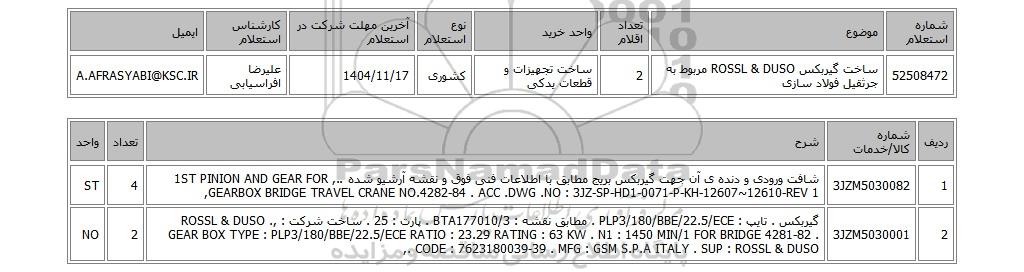 | 52508472 | ساخت گیربکس ROSSL & DUSO مربوط به جرثقیل فولاد سازی | 2 | ساخت تجهیزات و قطعات یدکی | کشوری | 1404/11/17 | علیرضا افراسیابی | A.AFRASYABI@KSC.IR |