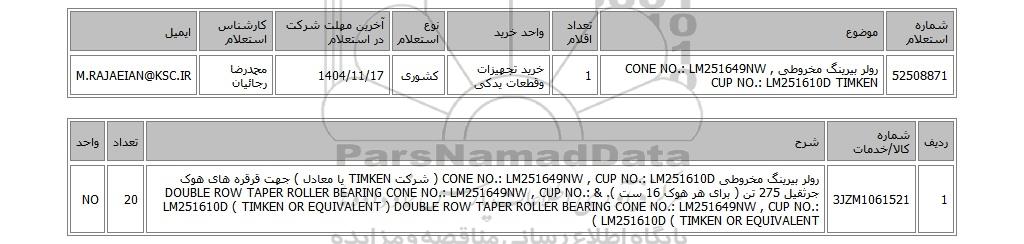 | 52508871 | رولر بیرینگ مخروطی CONE NO.: LM251649NW , CUP NO.: LM251610D TIMKEN | 1 | خرید تجهیزات وقطعات یدکی | کشوری | 1404/11/17 | محمدرضا رجائیان | M.RAJAEIAN@KSC.IR |