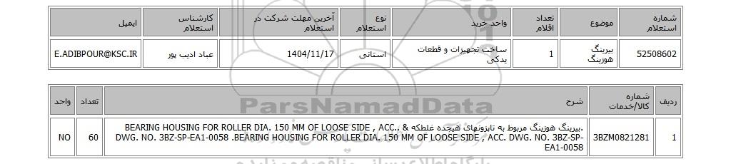 | 52508602 | بیرینگ هوزینگ | 1 | ساخت تجهیزات و قطعات یدکی | استانی | 1404/11/17 | عباد ادیب پور | E.ADIBPOUR@KSC.IR |