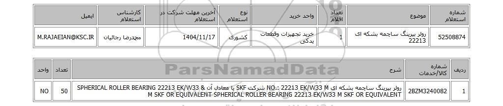 | 52508874 | رولر بیرینگ ساچمه بشکه ای 22213 | 1 | خرید تجهیزات وقطعات یدکی | کشوری | 1404/11/17 | محمدرضا رجائیان | M.RAJAEIAN@KSC.IR |