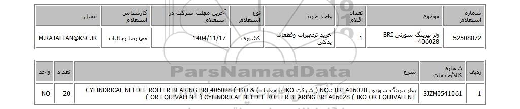 | 52508872 | ولر بیرینگ سوزنی BRI 406028 | 1 | خرید تجهیزات وقطعات یدکی | کشوری | 1404/11/17 | محمدرضا رجائیان | M.RAJAEIAN@KSC.IR |