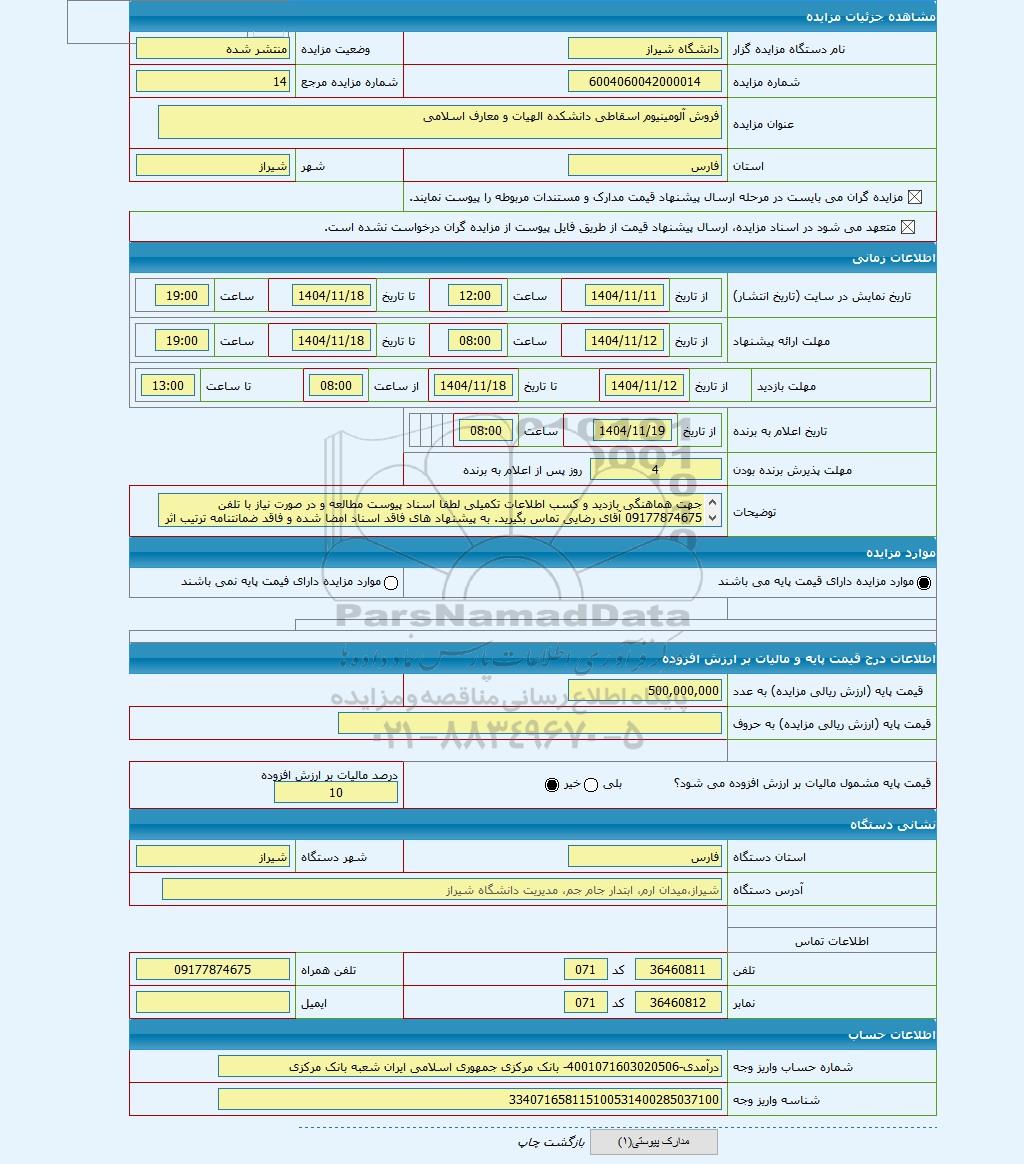 | نام دستگاه مزایده گزار | دانشگاه شیراز | وضعیت مزایده | منتشر شده | |