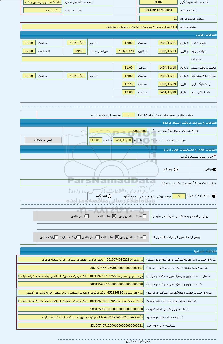 | شماره مورد اجاره | 5104091407000004 | نوع برگزاری مزایده | مزایده عمومی | |