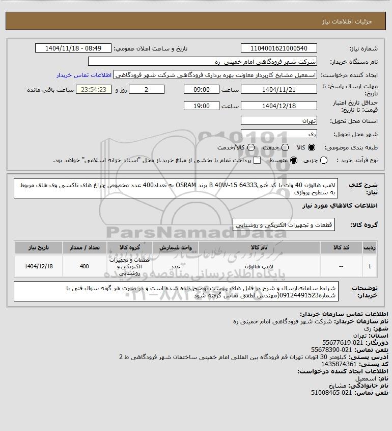 استعلام لامپ هالوژن 40 وات با کد فنیB 40W-15 64333 برند OSRAM به تعداد400 عدد مخصوص چراغ های تاکسی وی های مربوط به سطوح پروازی, استعلام لامپ هالوژن 40 وات با کد فنیB 40W-15 64333 برند OSRAM به تعداد400 عدد مخصوص چراغ های تاکسی وی های مربوط به سطوح پروازی