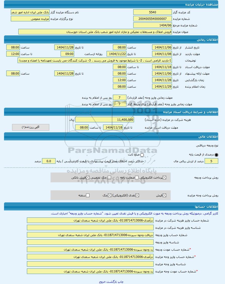 | کد مزایده گزار | نام دستگاه مزایده گزار | بانک ملی ایران اداره امور شعب استان خوزستان | ||