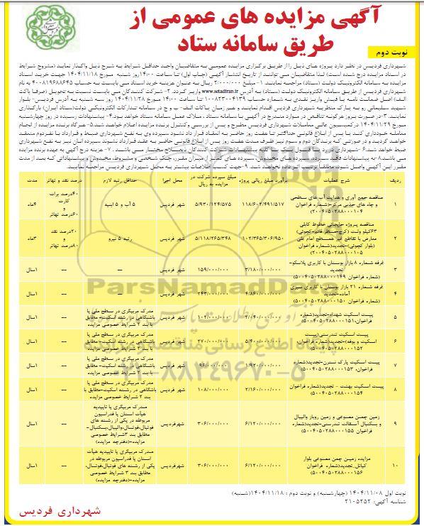 شهرداری فردیس در نظر دارد پروژه های ذیل را از طریق برگزاری مزایده عمومی به متقاضیان واجد حداقل شرایط به شرح ذیل واگذار نماید مشروح شرایط در اسناد مناقصه درج شده است لذا متقاضیان میتوانند از تاریخ انتشار آگهی چاپ اول تا ساعت 14:00 روز شنبه مورخ 1404.11.18 جهت خرید اسناد مناقصه به سامانه الکترونیک دولت (ستاد) مراجعه نمایند.