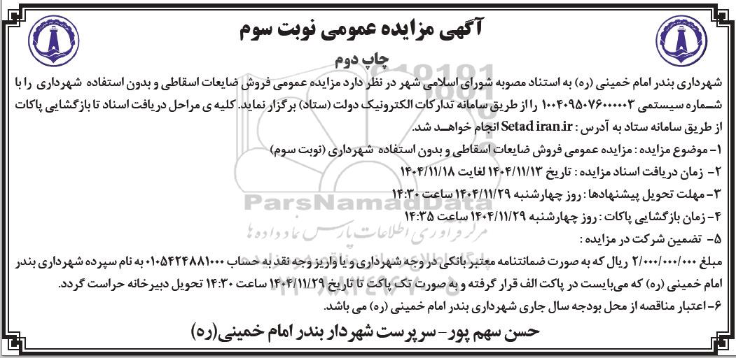 شهرداری بندر امام خمینی (ره) به استناد مصوبه شورای اسلامی شهر در نظر دارد مزایده عمومی فروش ضایعات اسقاطی و بدون استفاده شهرداری را به شماره سیستمی 1004095076000003 را از طریق سامانه تدارکات الکترونیک دولت (ستاد) برگزار نماید کلیه ی مراحل دریافت اسناد تا بازگشایی پاکات از طریق سامانه ستاد به آدرس سایت ستاد ایران انجام خواهد شد.