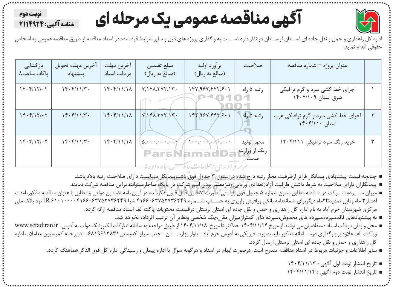 | 2 | اجرای خط کشی سرد و گرم ترافیکی غرب استان 1404.110 | 142.967.442.601 | 7.148.372.130 | 1404.11.18 | 1404.11.30 | 1404.12.02 | |