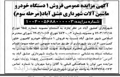 شهرداری عشق آباد در نظر دارد به استناد مصوبه شماره 155 مورخ 1403.12.18 و مصوبه شماره 02- 182 مورخ 1404.10.06 شورای محترم اسلامی شهر عشق آباد نسبت به فروش 1 دستگاه خودرو کامیون خاور کمپرسی 6 تن بنز شهرداری از طریق مزایده عمومی (مرحله سوم) اقدام نماید. لذا متقاضیان محترم میتوانند جهت کسب اطلاعات بیشتر به سامانه ستاد ایران یا سایت شهرداری عشق آباد به آدرس www.eshghabad.ir مراجعه نمایند. همچنین جهت رویت مورد مزایده می توان با هماهنگی قبلی با آقای رضا مهربان با شماره تماس 09137780173 به واحد موتوری شهرداری مراجعه نمایند.