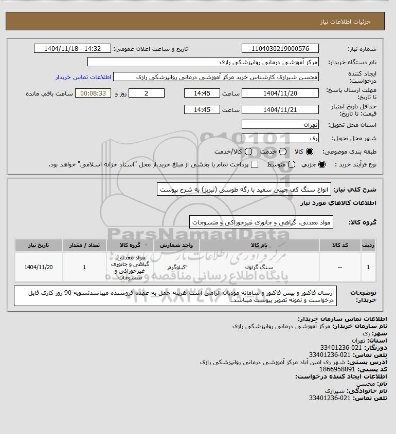 | 1 | -- | سنگ گراول | کیلوگرم | مواد معدنی، گیاهی و جانوری غیرخوراکی و منسوجات | 1 | 1404/11/20 |