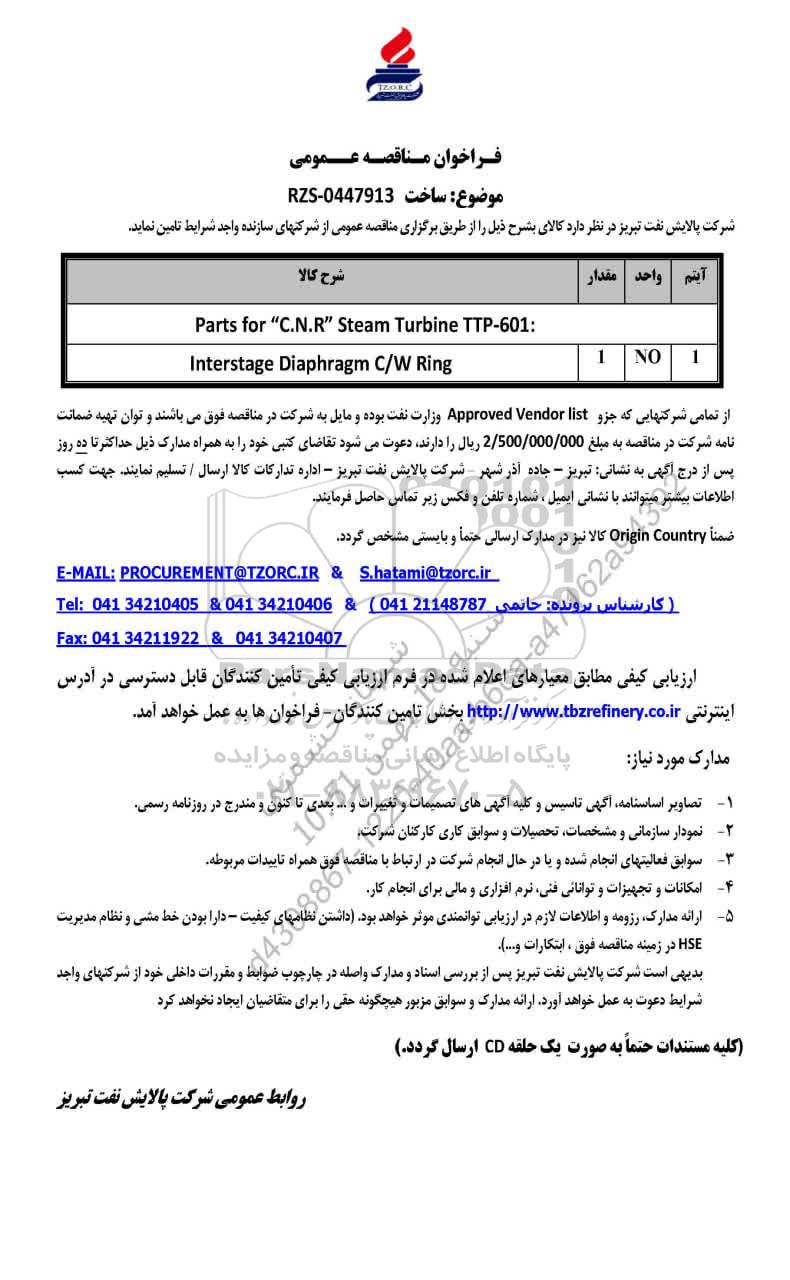 از تمامی شرکتهایی که جزو Approved Vendor list وزارت نفت بوده و مایل به شرکت در مناقصه فوق می باشند و توان تهیه ضمانت نامه شرکت در مناقصه به مبلغ 2.500.000.000 ریال را دارند، دعوت می شود تقاضای کتبی خود را به همراه مدارک ذیل حداکثر تا ده روز پس از درج آگهی به نشانی: تبریز - جاده آذرشهر - شرکت پالایش نفت تبریز- اداره تدارکات کالا ارسال/ تسلیم نمایند. جهت کسب اطلاعات بیشتر می توانند با نشانی ایمیل، شماره تلفن و فکس زیر تماس حاصل فرمایید.