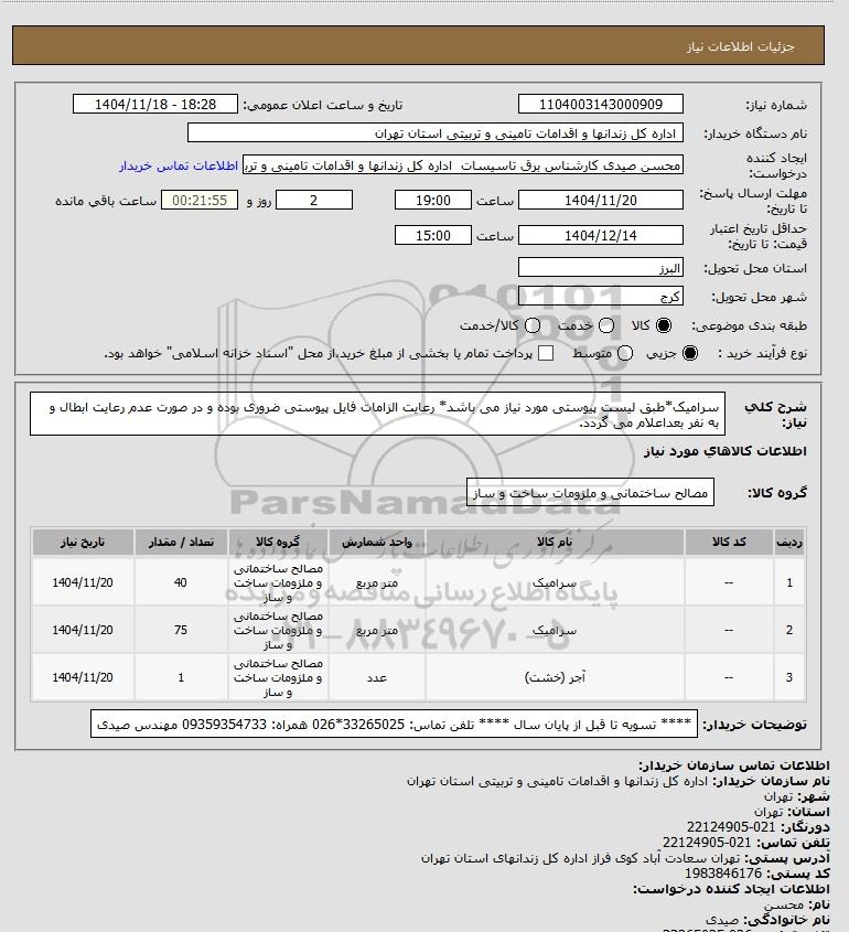 شرح کلی نیاز: سرامیک*طبق لیست پیوستی مورد نیاز می باشد* رعایت الزامات فایل پیوستی ضروری بوده و در صورت عدم رعایت ابطال و به نفر بعداعلام می گردد.