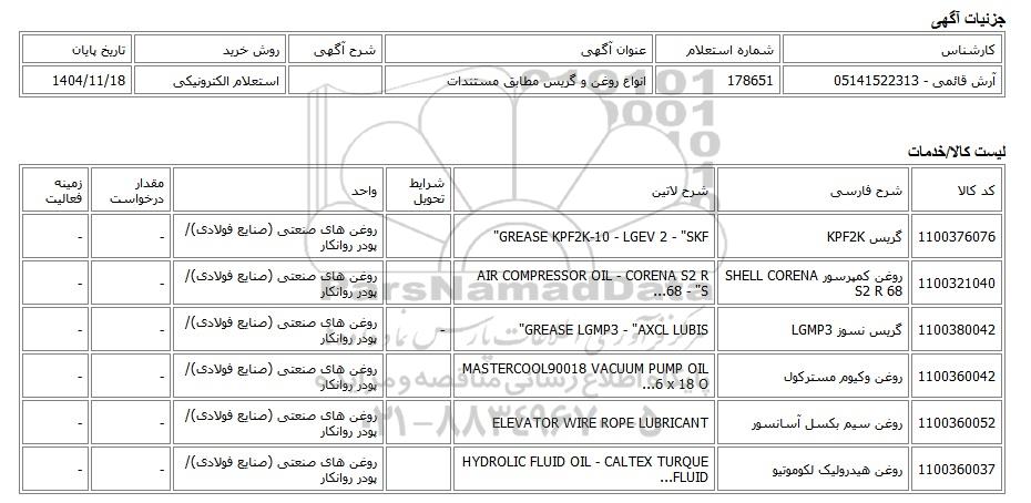 | آرش قائمی - 05141522313 | 178651 | انواع روغن و گریس مطابق مستندات | استعلام الکترونیکی | 1404/11/18 |