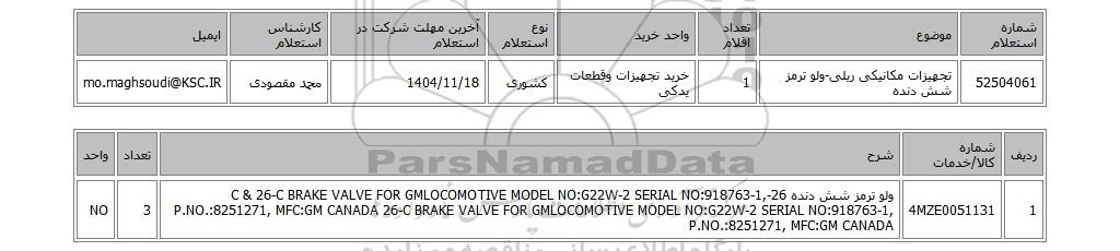| 52504061 | تجهیزات مکانیکی ریلی-ولو ترمز شش دنده | 1 | خرید تجهیزات وقطعات یدکی | کشوری | 1404/11/18 | محمد مقصودی | mo.maghsoudi@KSC.IR |