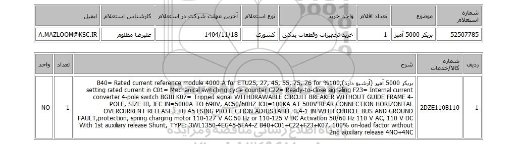 | 52507785 | بریکر 5000 آمپر | 1 | خرید تجهیزات وقطعات یدکی | کشوری | 1404/11/18 | علیرضا مظلوم | A.MAZLOOM@KSC.IR |