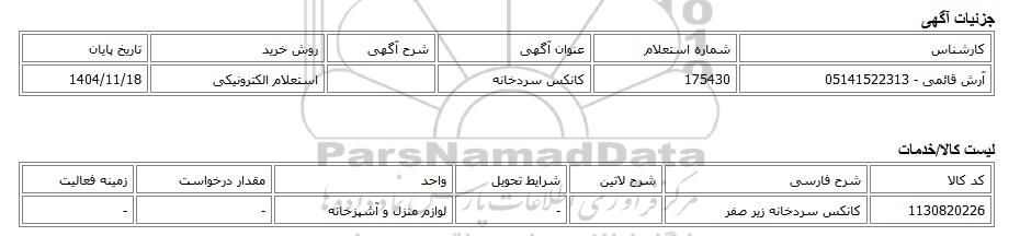 | آرش قائمی - 05141522313 | 175430 | کانکس سردخانه | استعلام الکترونیکی | 1404/11/18 |