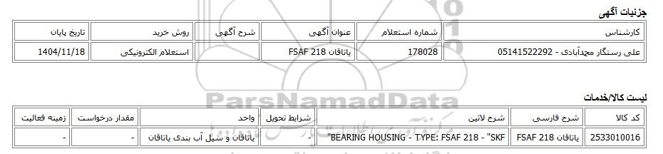 | علی رستگار محمدآبادی - 05141522292 | 178028 | یاتاقان FSAF 218 | استعلام الکترونیکی | 1404/11/18 |