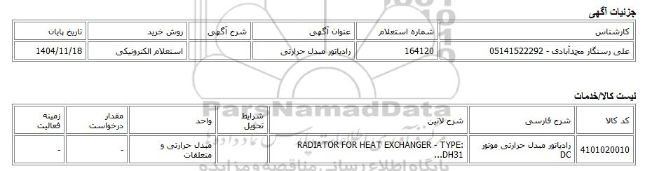 | علی رستگار محمدآبادی - 05141522292 | 164120 | رادیاتور مبدل حرارتی | استعلام الکترونیکی | 1404/11/18 |