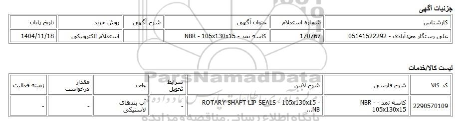| علی رستگار محمدآبادی - 05141522292 | 170767 | کاسه نمد - NBR - 105x130x15 | استعلام الکترونیکی | 1404/11/18 |