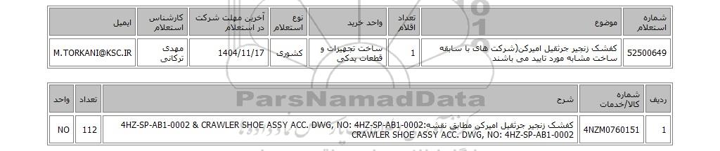 | 52500649 | کفشک زنجیر جرثقیل امیرکن(شرکت های با سابقه ساخت مشابه مورد تایید می باشند | 1 | ساخت تجهیزات و قطعات یدکی | کشوری | 1404/11/17 | مهدی ترکانی | M.TORKANI@KSC.IR |