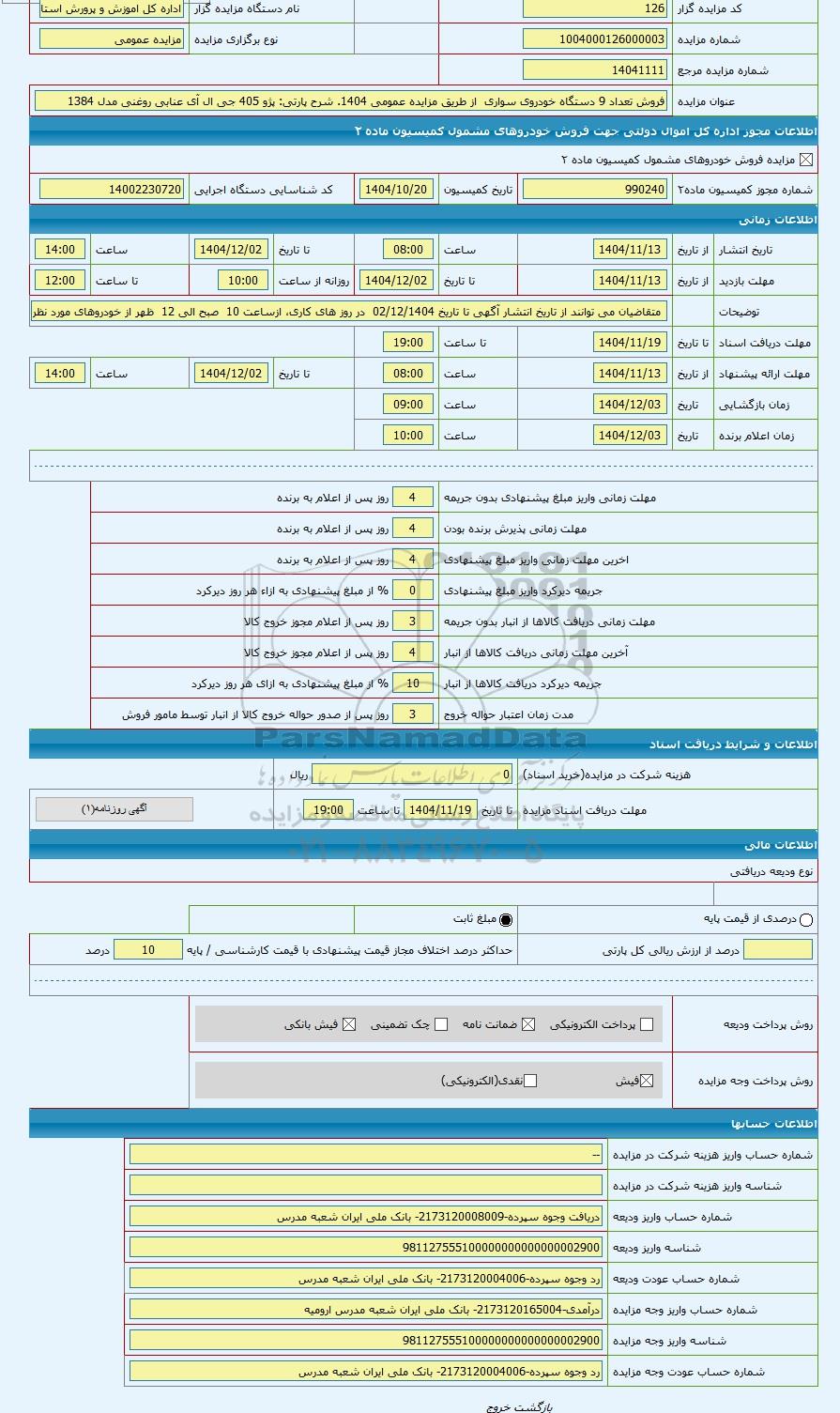عنوان مزایدهفروش تعداد 9 دستگاه خودروی سواری از طریق مزایده عمومی 1404