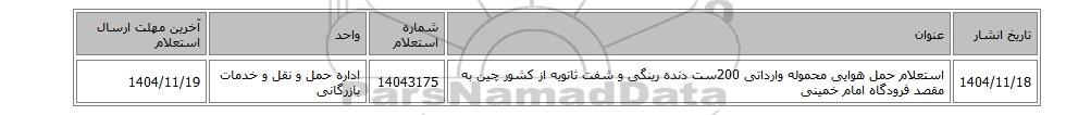 1404/11/18استعلام حمل هوایی محموله وارداتی 200ست دنده رینگی و شفت ثانویه از کشور چین به مقصد فرودگاه امام خمینی14043175اداره حمل و نقل و خدمات بازرگانی1404/11/19