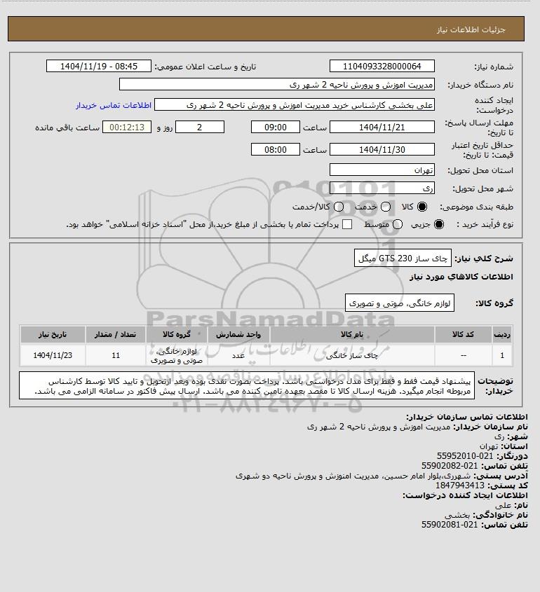 شرح کلی نیاز: چای ساز GTS 230 میگل