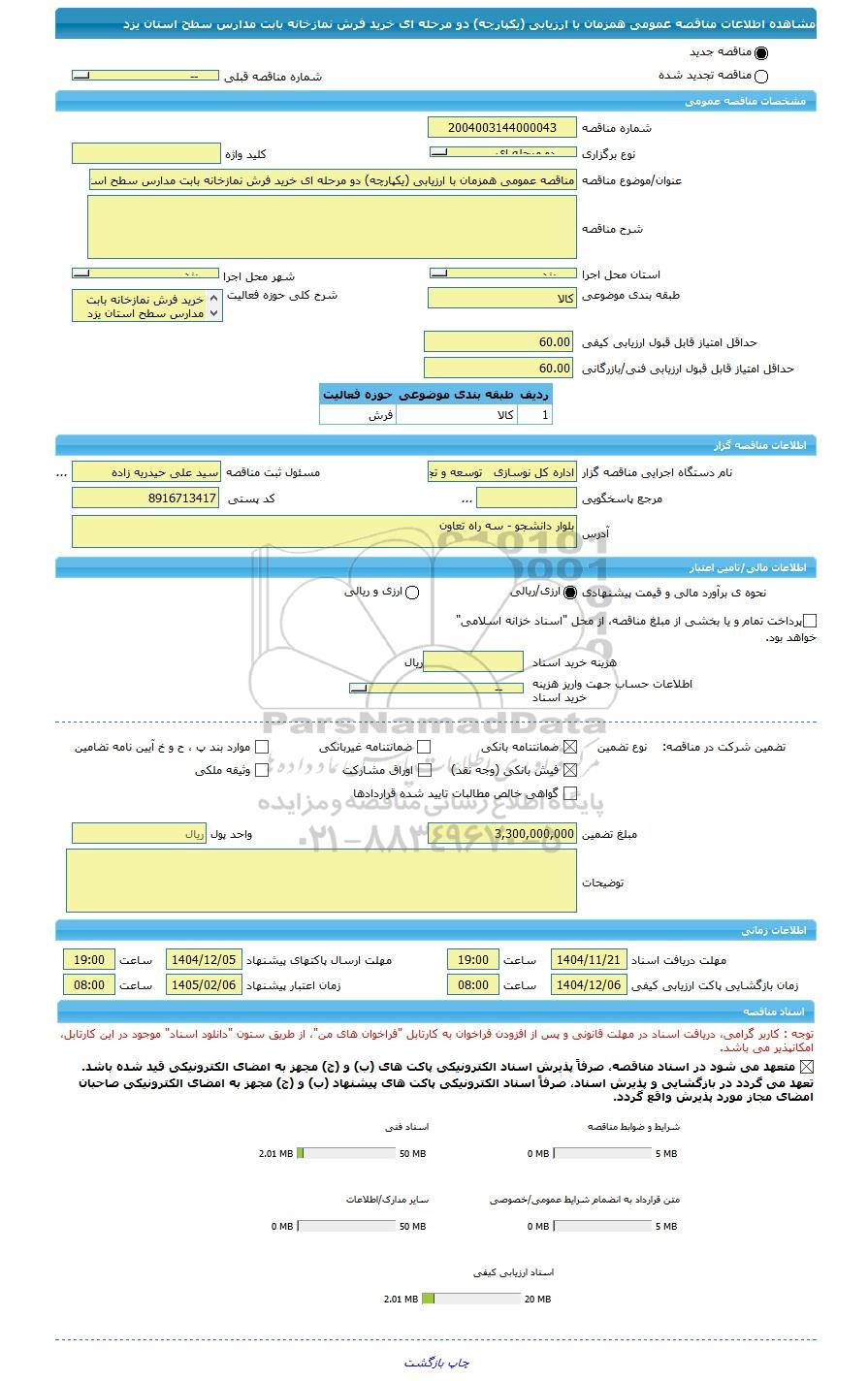 عنوان/موضوع مناقصهمناقصه عمومی همزمان با ارزیابی (یکپارچه) دو مرحله ای خرید فرش نمازخانه بابت مدارس سطح استان یزد