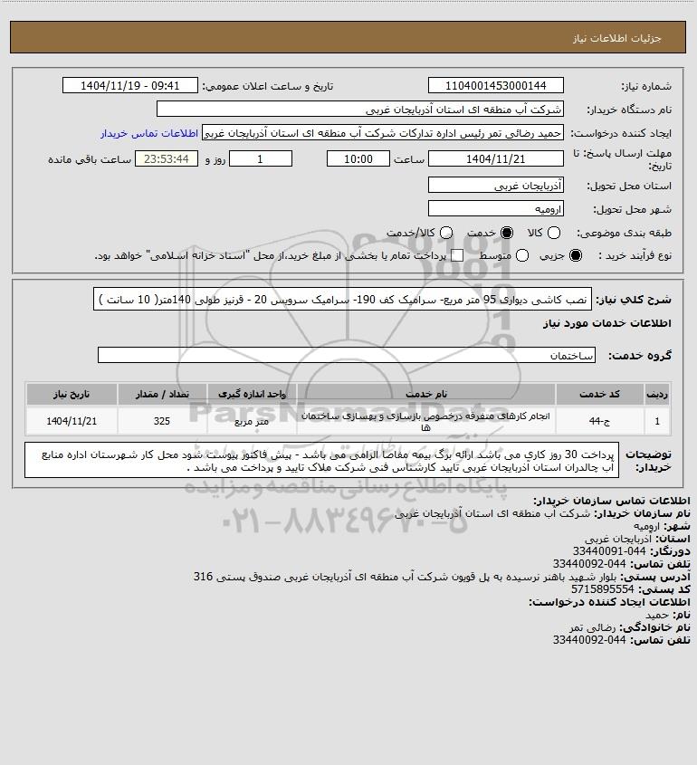 شرح کلی نیاز: نصب کاشی دیواری 95 متر مریع- سرامیک کف 190- سرامیک سرویس 20 - قرنیز طولی 140متر( 10 سانت )