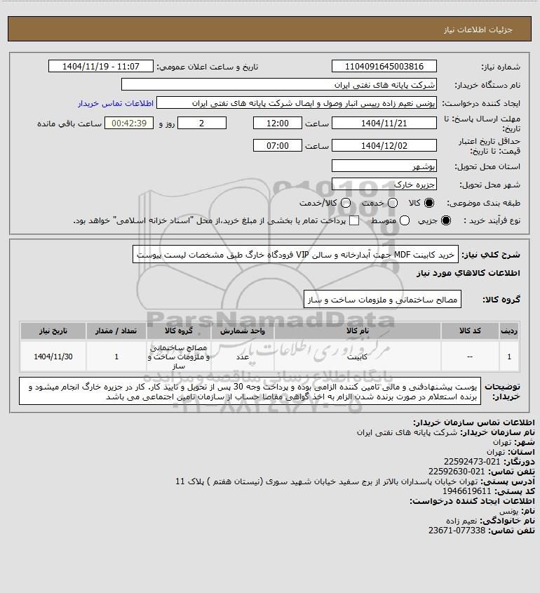 شرح کلی نیاز: خرید کابینت MDF جهت آبدارخانه و سالن VIP فرودگاه خارگ طبق مشخصات لیست پیوست