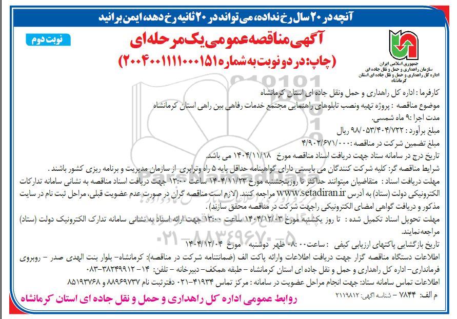 موضوع مناقصه : پروژه تهیه و نصب تابلوهای راهنمایی مجتمع خدمات رفاهی بین راهی استان کرمانشاه