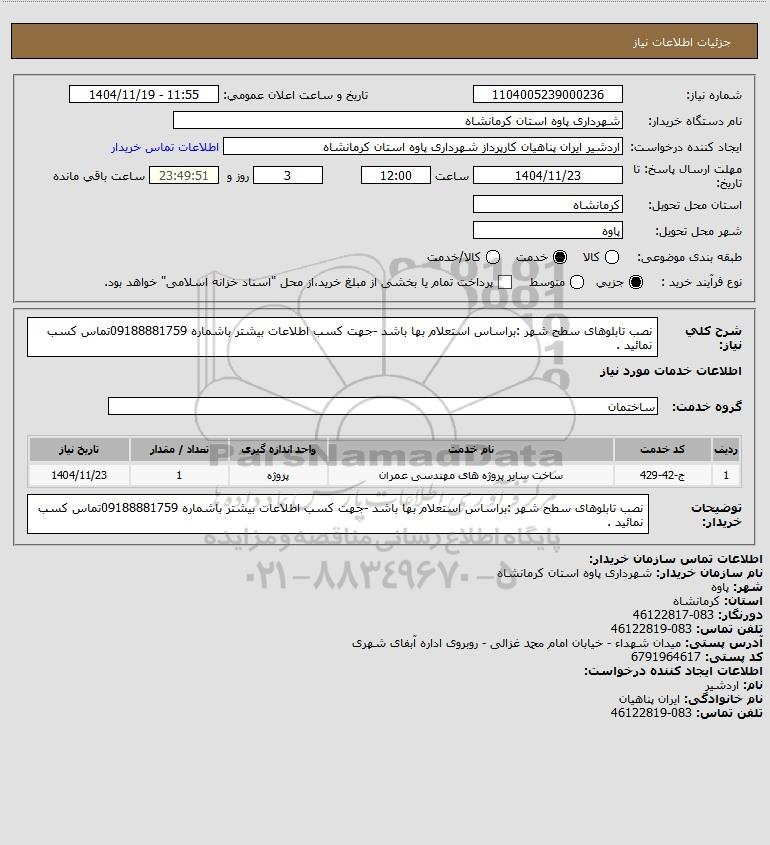 شرح کلی نیاز: نصب تابلوهای سطح شهر :براساس استعلام بها باشد -جهت کسب اطلاعات بیشتر باشماره 09188881759تماس کسب نمائید .